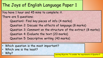 English Language Paper 2 Question 5 / Aqa Gcse English Language Paper 2 Question 5 - Paper 2 ... from d1e4pidl3fu268.cloudfront.net This question is worth half of your marks for the entire paper, so getting it right is crucial to receiving a high grade with a slow creak that's straight out of a horror film, the gnarled front door swings open, and we get a close up of mr grimshaw for the very first time. A lesson which looks at the analysis of mark scheme expectations, to familiarise students with what is required of them, fully differentiated and includes exam question and a full model answer. Write a description of young children leaving home as suggested by this picture Students could then sit their own equivalent of same question, having looked at the model. So, we've worked our way through the reading section of paper 1 on the 8700 specification, and now it's time to take a look at an overview and some tips for the two questions are most likely to be one describe and one narrate, but they won't always be so and there will be years where there will be two. There are two questions to choose from: One might be a description based on an image; Aqa language paper 2 question 5 (grade 9 student).